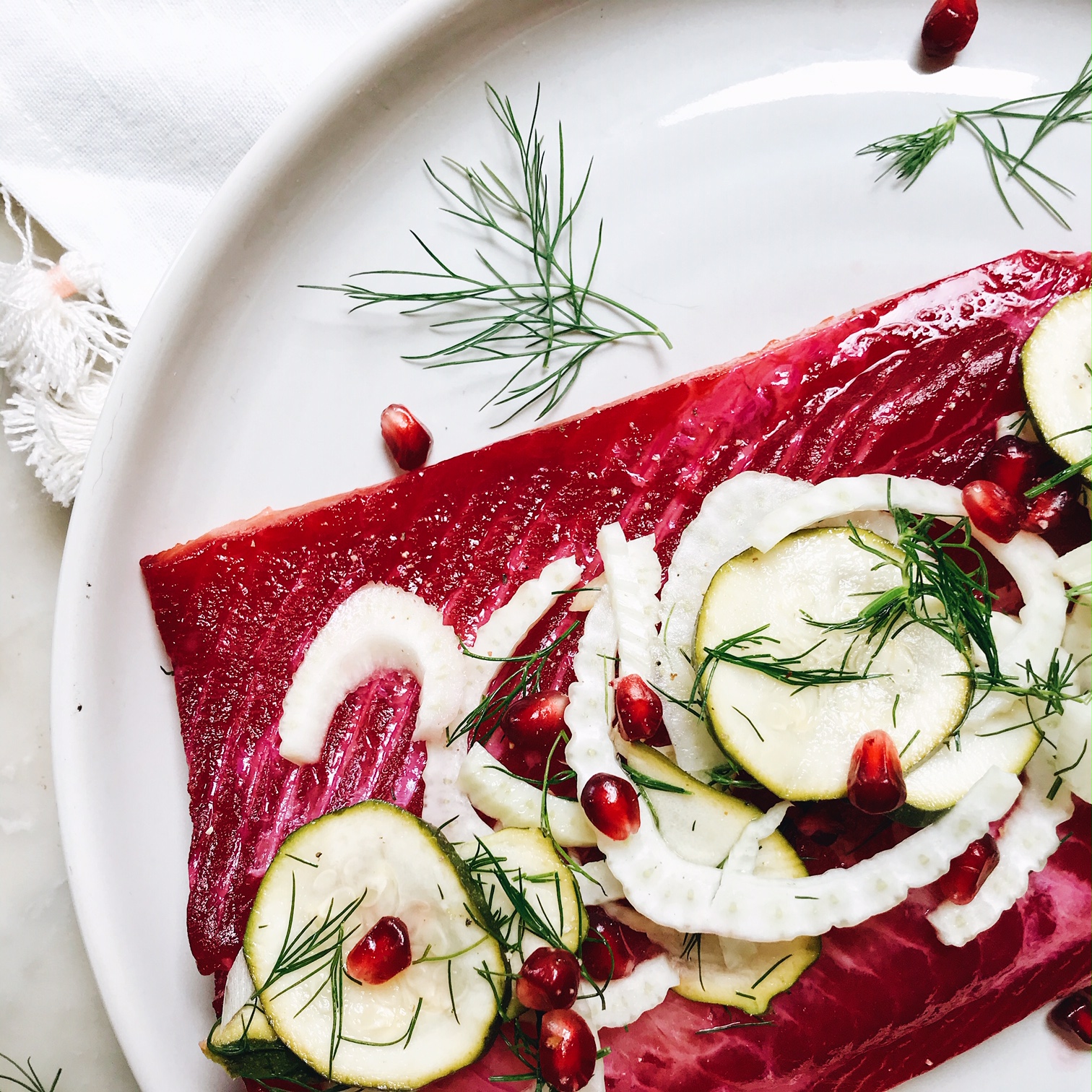 Cuando esté listo para servir, escurra la ensalada, agregue el eneldo y la granada (si se usa) y espolvoree encima, coloque el aderezo a un lado y córtelo en rodajas finas. Alternativamente, corte el pescado en rodajas finas hasta que esté todo cortado y colóquelo en un plato interpretado con ensalada.