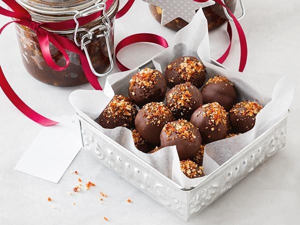 Rompe los caramelos de nuez de macadamia. Transfiera al tazón de un procesador de alimentos pequeño. Trabaje hasta que esté finamente picado (no deje que la mezcla se diluya demasiado o perderá su crujido). Agregue la fruta picada y la mitad de la mezcla de nueces de macadamia a la mezcla de chocolate. Revuelve para combinar. Refrigere por 10 minutos o hasta que la mezcla esté lo suficientemente espesa como para formar bolas.