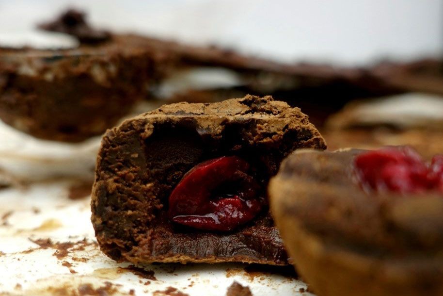 Aplana la bola de ganache con la palma de tu mano y coloca una cereza en el centro.