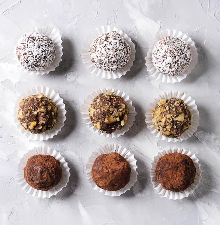 Trufas de chocolate envueltas en coco, nueces o cacao