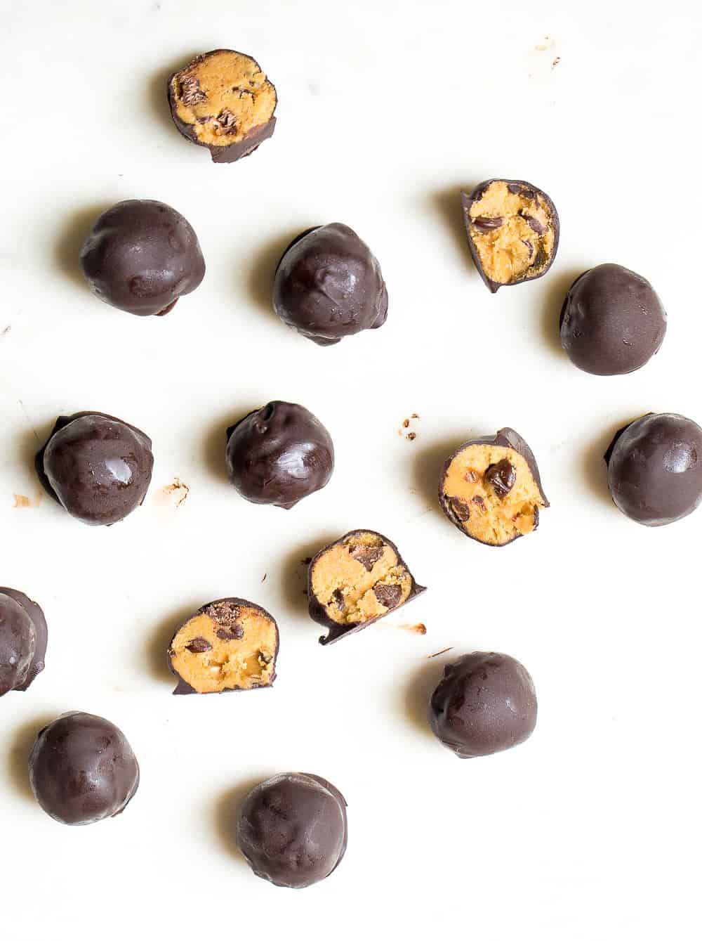 Dato número 1: Estas trufas de masa de galleta con chispas de chocolate pueden* haber desaparecido de la casa más rápido que cualquier otro postre que haya preparado durante todo el verano.