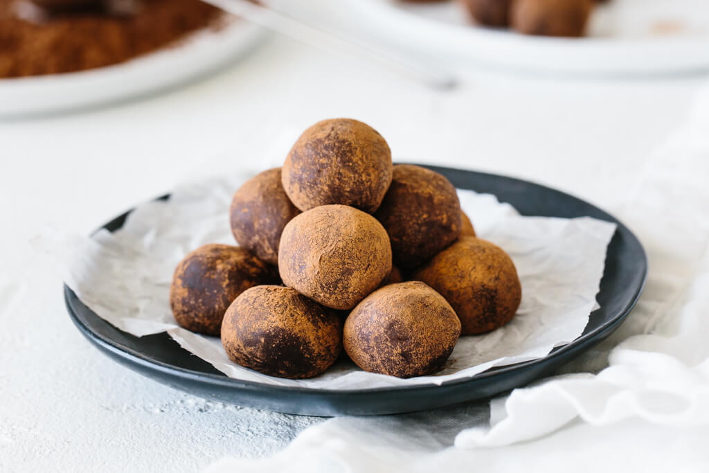Enrolle inmediatamente las bolas de cacao en polvo y colóquelas en un plato.