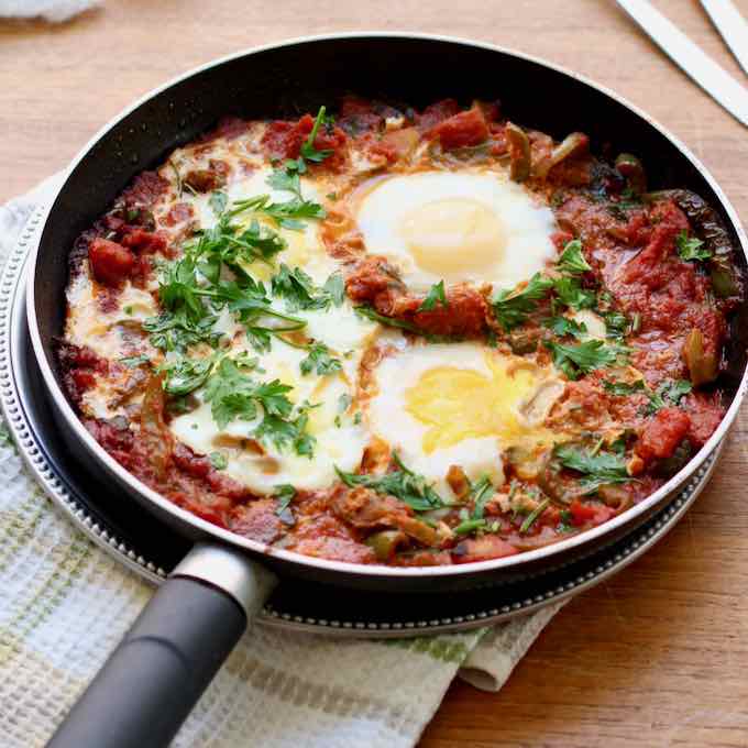 Los menemen también se pueden hacer con huevos revueltos, así que en lugar de romperlos en la sartén, bátelos antes de verterlos sobre las verduras.