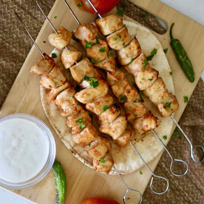 Taviş tavuk (o shish taouk) es una deliciosa receta de brochetas de pechuga de pollo marinadas, tradicional de Oriente Medio.