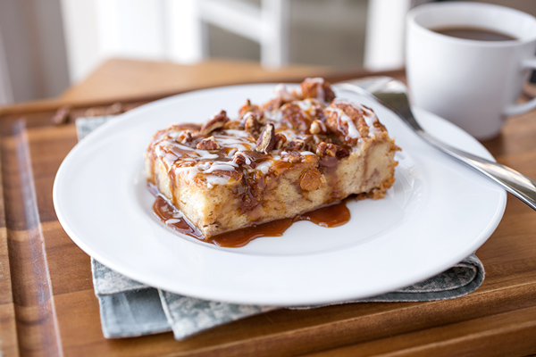6 rollos de canela (alrededor de 3 onzas cada uno), ¼ taza de pasas doradas picadas 6 huevos enteros 3 1/2 tazas ¼ taza de azúcar moreno 2 cucharaditas de extracto puro de vainilla 1 cucharadita de canela molida • Una pizca de sal ¼ taza de salsa de caramelo (de buena calidad, como Trader marca Joe’s) Crema cremosa (receta a continuación) ¼ taza de nueces tostadas