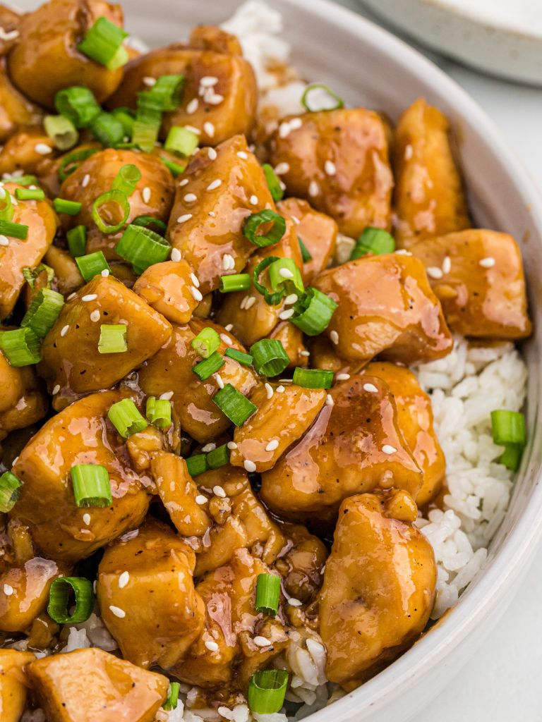 - Nuggets de pollo: Corté el pollo en trozos de aproximadamente 1 pulgada. ¡No se necesita regla! Si las piezas de pollo son más grandes, solo necesitarán más tiempo para cocinarse. Por otro lado, si el pollo se corta en trozos más pequeños, el tiempo de cocción no durará mucho. Básicamente, el pollo puede ser tan pequeño o grande como quieras, pero asegúrate de que esté completamente cocido antes de agregar la salsa teriyaki. Una vez que se agrega la salsa, no hay suficiente tiempo antes de que espese para continuar cocinando el pollo.