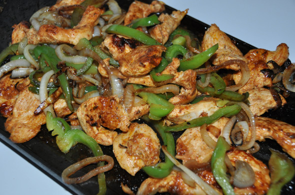 - Limpie la parrilla con una toalla de papel, agregue otro chorrito de aceite de oliva y agregue suavemente los trozos de pollo (no la marinada) en una sola capa. Mientras se cocina el pollo, agregue dos chorros de salsa de soya baja en sodio. Cocine el pollo durante 7-8 minutos o hasta que esté dorado y bien cocido, volteándolo una vez. Agregue la cebolla y el pimiento a la sartén. Sirve en tortillas de harina calientes con todos los ingredientes.