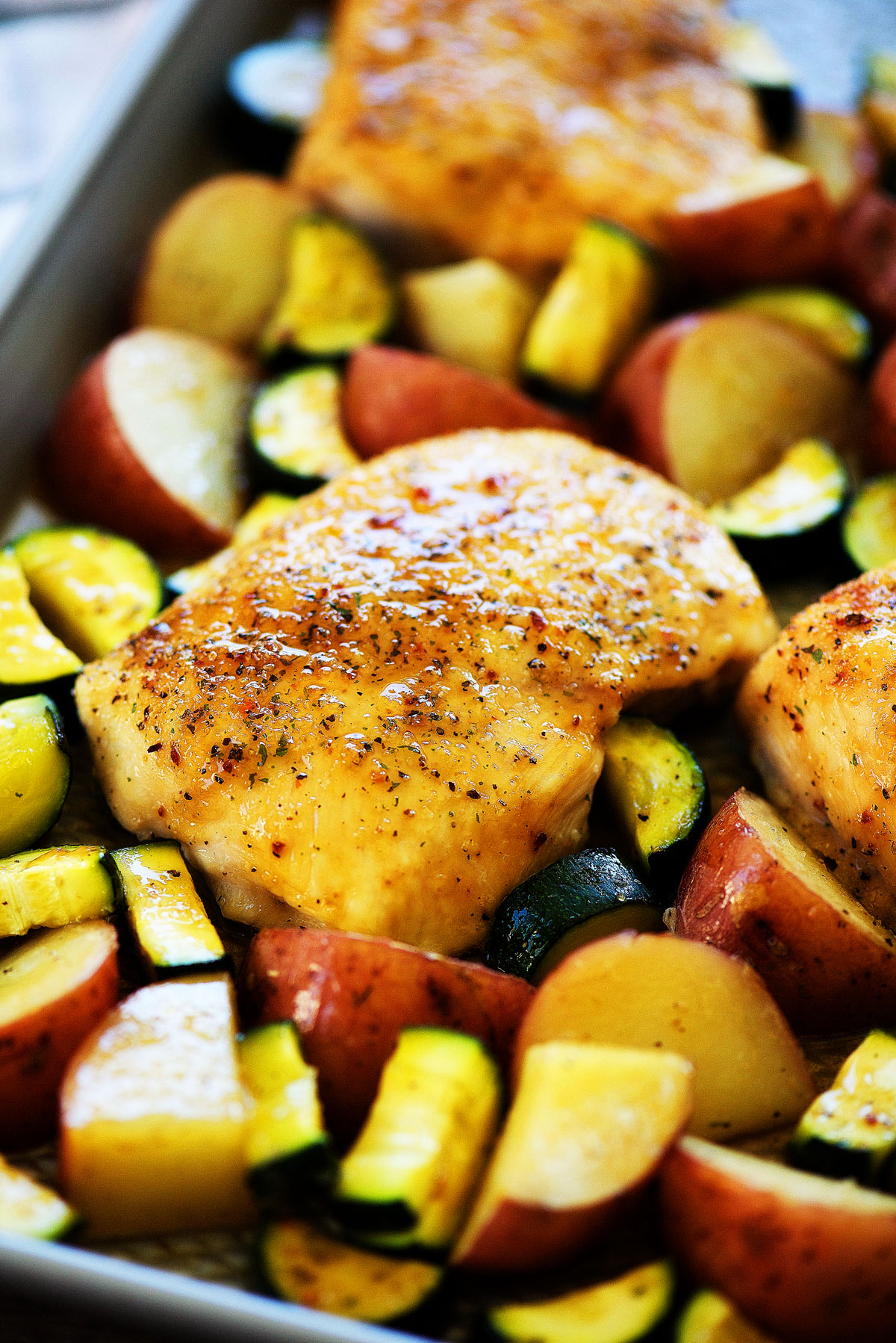 En lugar de solo el pollo, decidí que fuera una comida completa, así que agregué muchos calabacines y papas rojas. Puse todo en una bandeja para hornear y lo horneé. Mi casa olía increíble como si todo estuviera cocinado junto. Después de unos 35 minutos, la cena había terminado y estábamos listos para excavar. Honestamente, a toda mi familia le encantó este. Incluso los más pequeños. Claro, tuvieron que mojar los suyos en salsa ranchera, pero no los culpo. ¡Se alegró de que comieran!