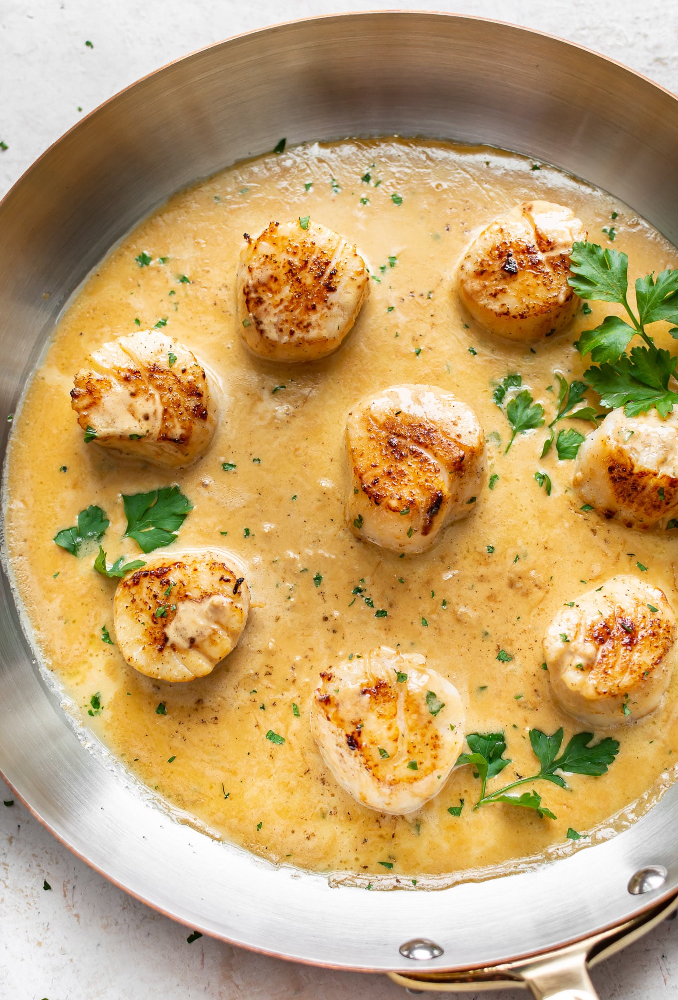 Mi hermana siempre me envía ideas de recetas, y esta es una de ellas. Se basa libremente en mi popular receta de pollo cremoso con ajo y es un milagro que no se me haya ocurrido mientras hacía salsas cremosas para todo, y el ajo podría ser mi segundo nombre. No hago vieiras muy a menudo, así que probablemente sea por eso que pienso.