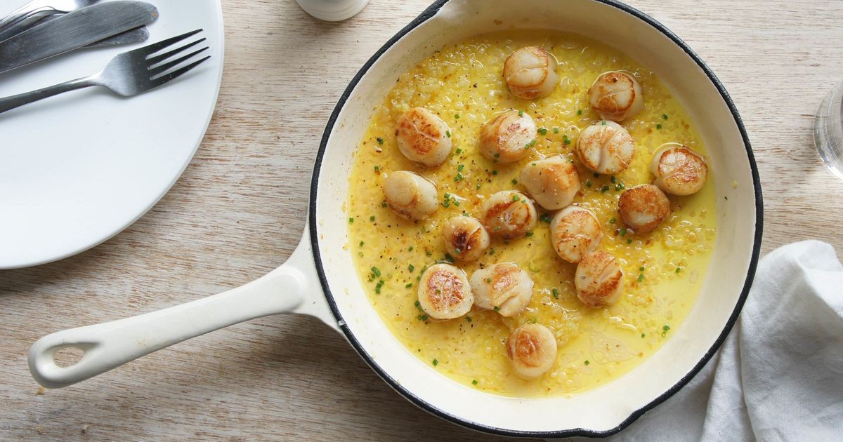Este plato es un gran plato principal. Use vieiras congeladas con huevos.