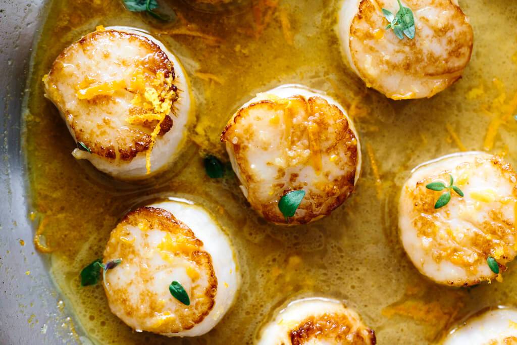 - Retire las vieiras en un plato y agregue la mantequilla, el jugo de naranja, el jugo de limón y el jengibre a la sartén hasta que hierva.