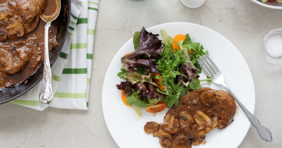 Regrese los filetes a la sartén, agregue los champiñones y mezcle bien.