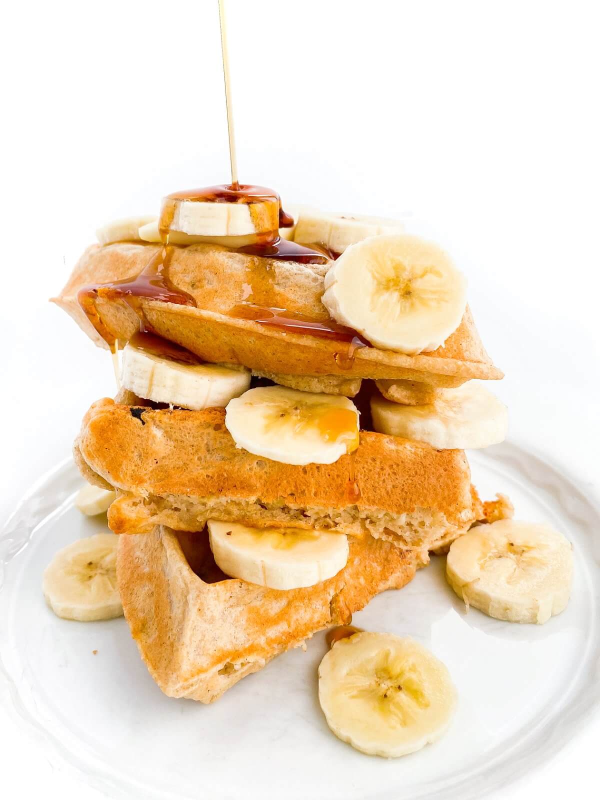 Estos waffles son deliciosos solos, pero me encanta servirlos con rebanadas adicionales de plátano, mantequilla y jarabe de arce.