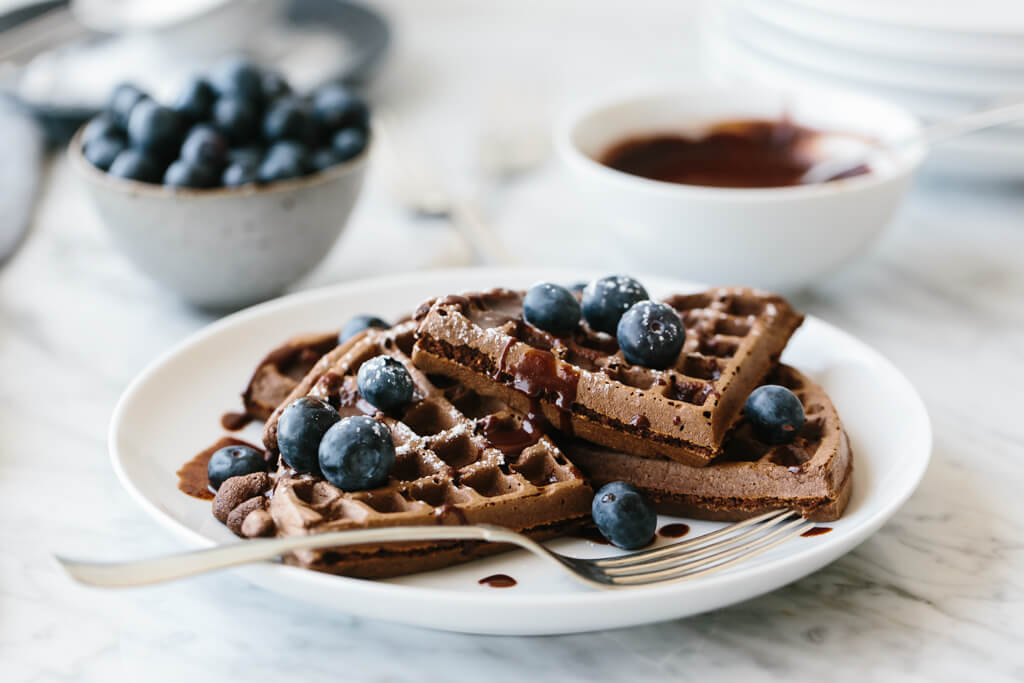 Sirva los waffles con una pizca de almíbar, un puñado de arándanos frescos y una pizca de azúcar en polvo.