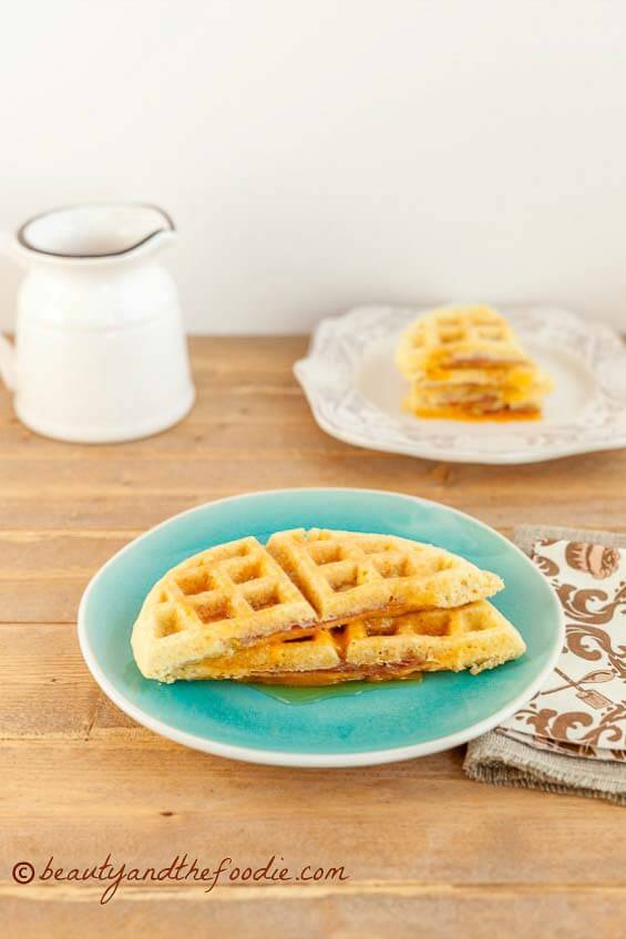 Los Waffles Rellenos de Queso Bajos en Carbohidratos son waffles primarios bajos en carbohidratos, sin granos, con jamón y queso en el centro.