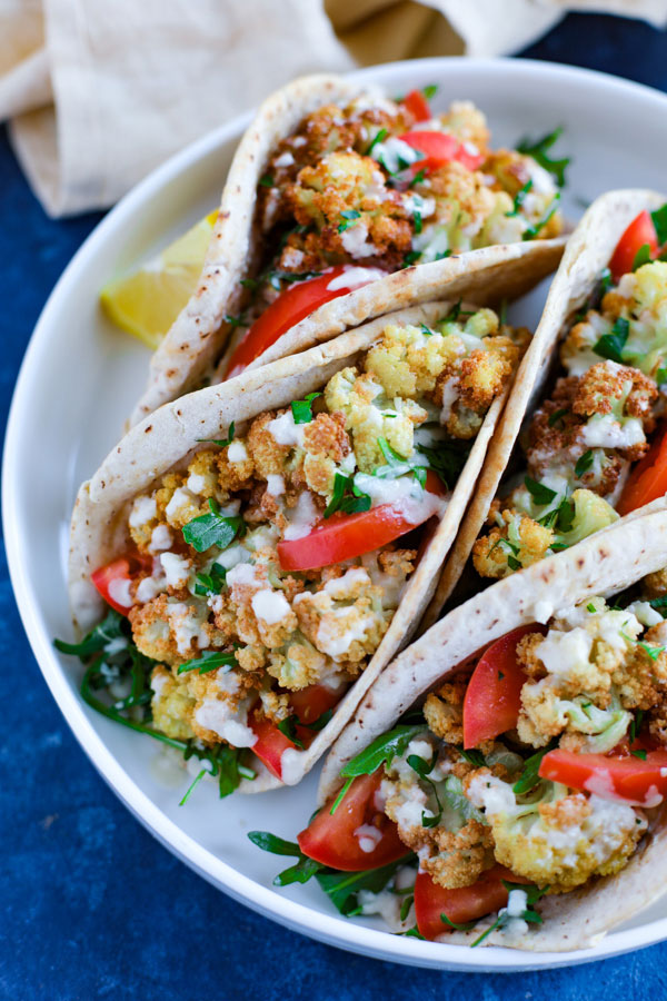 ¡Estas envolturas de pita rellenas son la receta perfecta para una cena vegetariana con un toque mediterráneo! Pan de pita suave y esponjoso con verduras frescas como rúcula y tomate. La coliflor asada cubre estas verduras para una opción vegetariana que se completa con una llovizna de salsa tahini fresca. Agréguelos con perejil y un poco de limón fresco para una cena deliciosa que estará feliz de preparar una y otra vez.