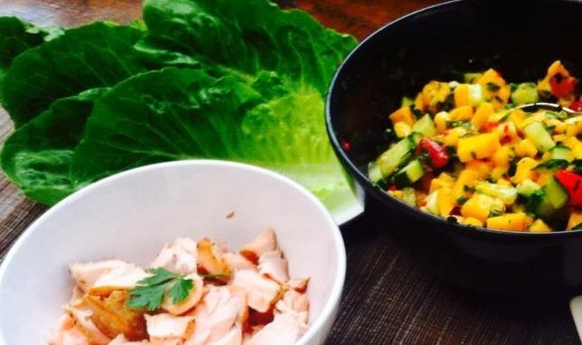 Sirva el salmón y el perejil en la mesa con las hojas de lechuga. Cada comensal puede poner un poco de perejil y salmón sobre la hoja de lechuga, enrollarla y comer.