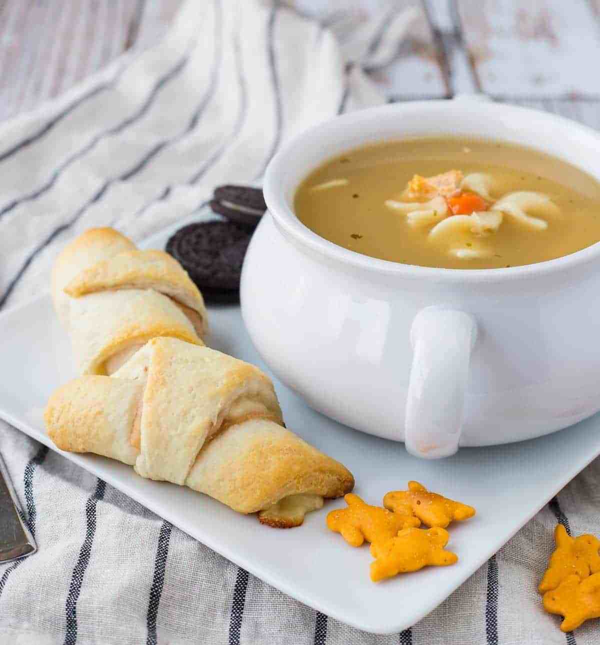 Quería combinar algo con su sopa orgánica de fideos con pollo, así que preparé estos sándwiches cremosos de pavo y queso rápidos y fáciles. ¿Sabías que Annie hizo rollos de media luna? ¡Y son orgánicos! Acabo de poner un poco de pavo y queso provolone en cada media luna antes de enrollarlo y asarlo. A mis hijos les gustó y a mí me encantó. Eran el complemento perfecto para la sopa. Quiero decir, ¿qué es mejor que una sopa lista para comer? ¡Todo lo que necesita hacer es calentarlo, ni siquiera necesita agregar agua!