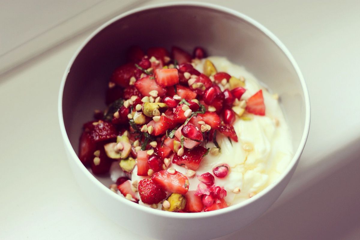 Cuando los días se vuelven más calurosos, nada mejor que mi tazón de yogur súper saludable hecho con yogur griego espeso, fresas dulces, granada, menta fresca, trigo sarraceno tostado y un puñado de pistachos.