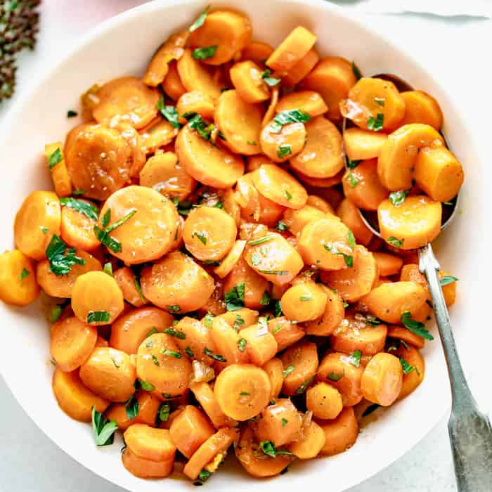 Hola amigos, hoy tengo mi receta favorita de zanahoria glaseada con arce para compartir con ustedes. Tienen un toque de mantequilla, cebollino y un toque de canela. Son geniales como guarnición simple para una estufa en Acción de Gracias o cualquier día de la semana.